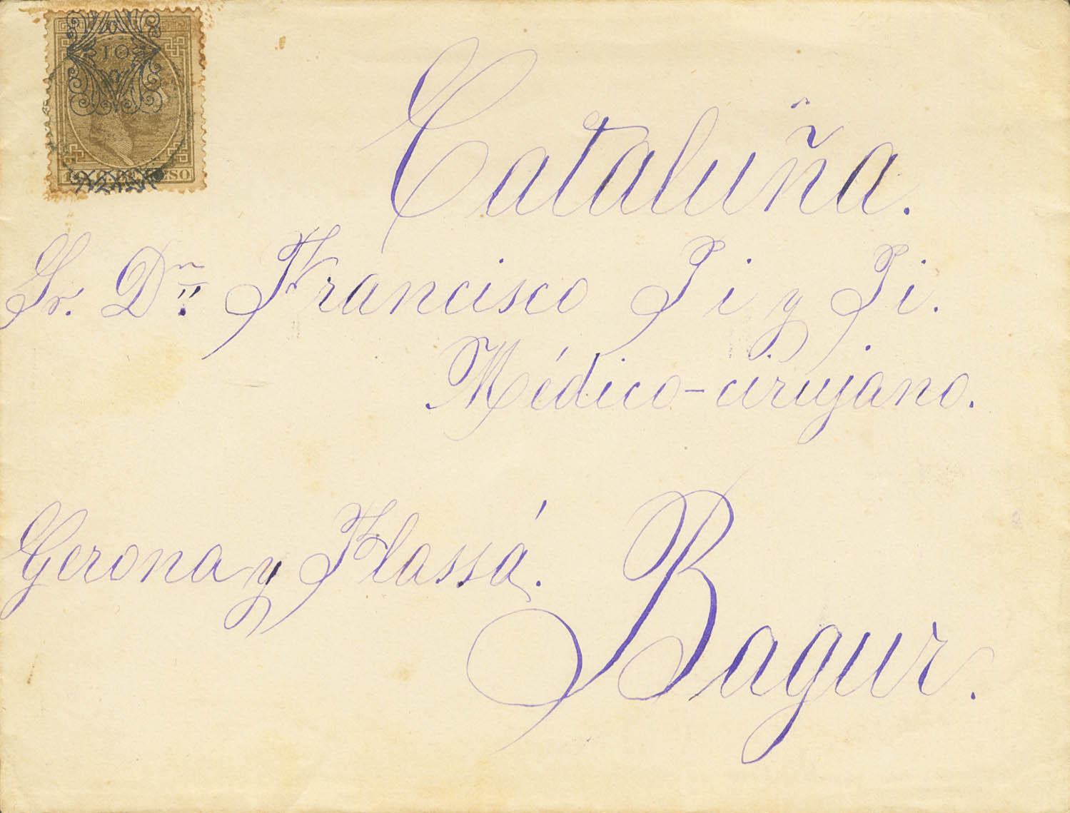78. 1883. 10 cts sobre 10 cts (Tipo b). Dirigida a BAGUR (GERONA). Al dorso llegada. MAGNIFICA Y RARISIMO USO DE LA EMISION DE ARAÑITAS. Cert. COMEX.