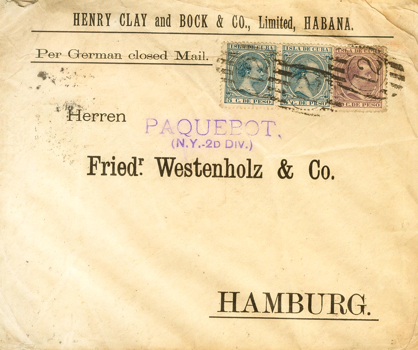 149(2), 151. 1897. 5 cts azul, dos sellos y 20 cts malva. LA HABANA a HAMBURGO. Matasello numeral "12" y en el frente impreso PER GERMAN CLOSED MAIL. MAGNIFICA.