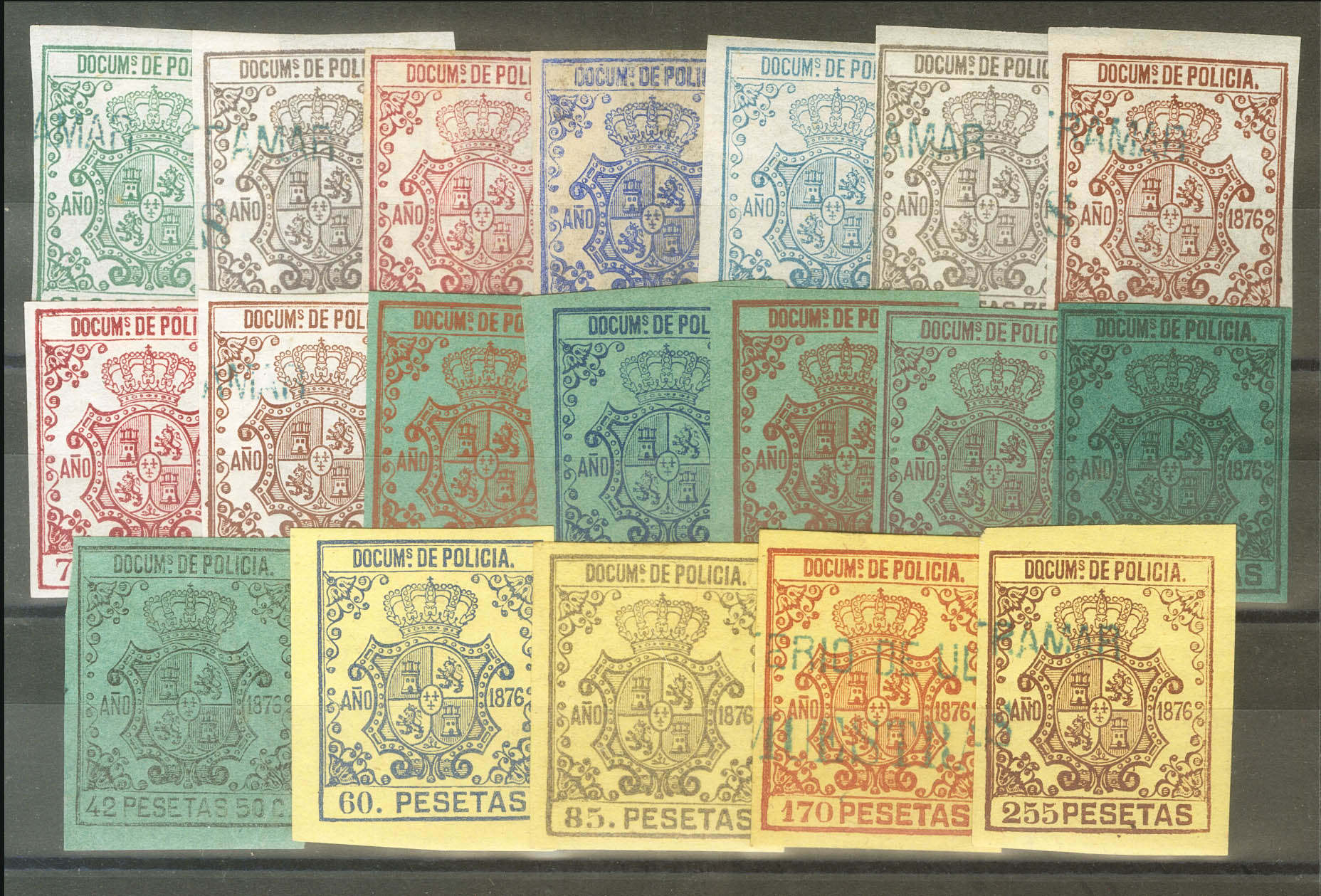 ★/(★)1876. DOCUMENTOS DE POLICIA de 1876. Serie completa, algunos valores con sobrecarga MINISTERIO DE ULTRAMAR / MUESTRAS. MAGNIFICA Y RARA. (Jones and Rodríguez BP190/08)
