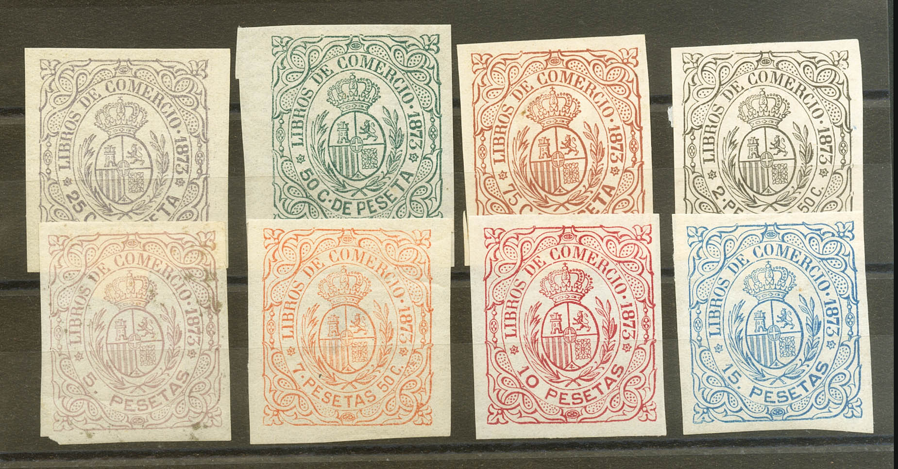 ★/(★)1872. LIBROS DE COMERCIO de 1873. Serie completa, ocho valores. MAGNIFICA. (Jones and Rodríguez CB9/16)