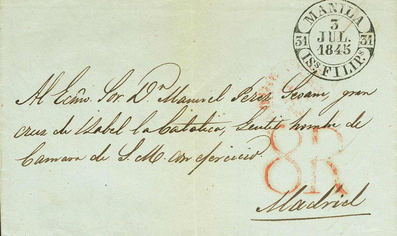 1845. CAGAYAN a MADRID. Baeza MANILA / IS.FILIP, en negro. MAGNIFICA E INUSUAL EN ESTA EXCEPCIONAL CALIDAD.