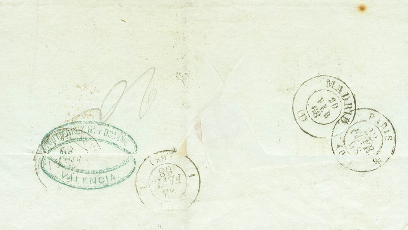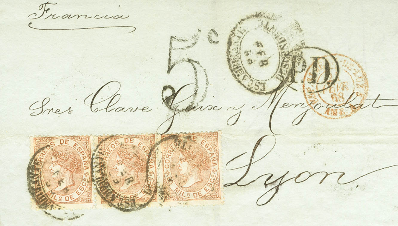 96(3). 1868. 50 mils castaño, tira de tres. VALENCIA a LYON (FRANCIA). Matasello EST. AMBULANTE / DESCENDENTE. MAGNIFICA Y RARA.
