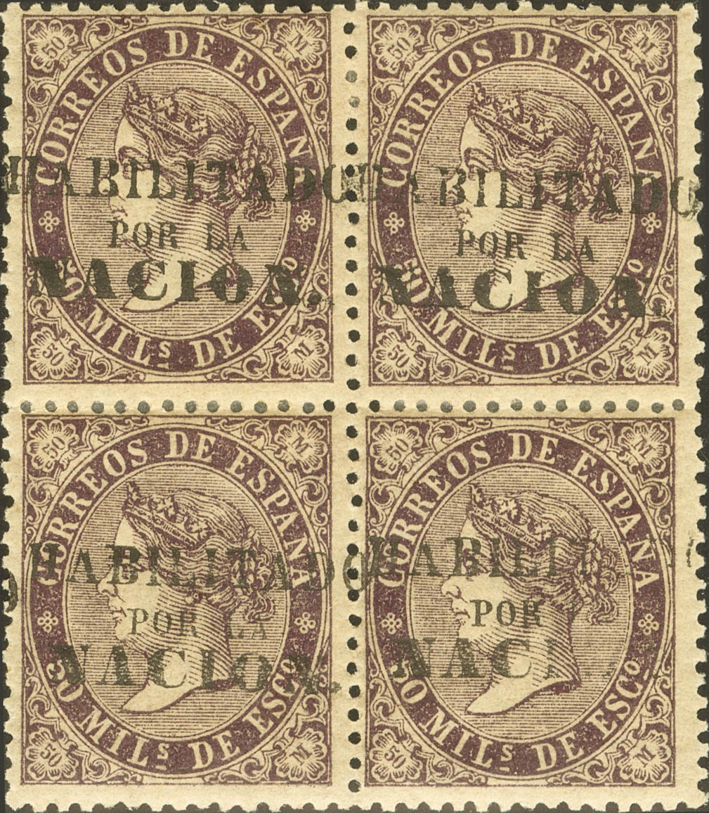 ★ 98(4). 1868. 50 mils violeta, bloque de cuatro. HABILITADO / POR LA / NACION, de Madrid. MAGNIFICO.