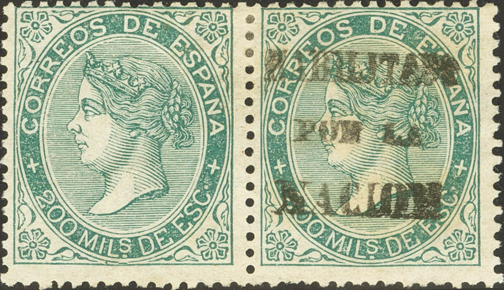 (★) 100. 1868. 200 mils verde, pareja. Un sello HABILITADO / POR LA / NACION, de Valladolid. MAGNIFICA Y RARA.