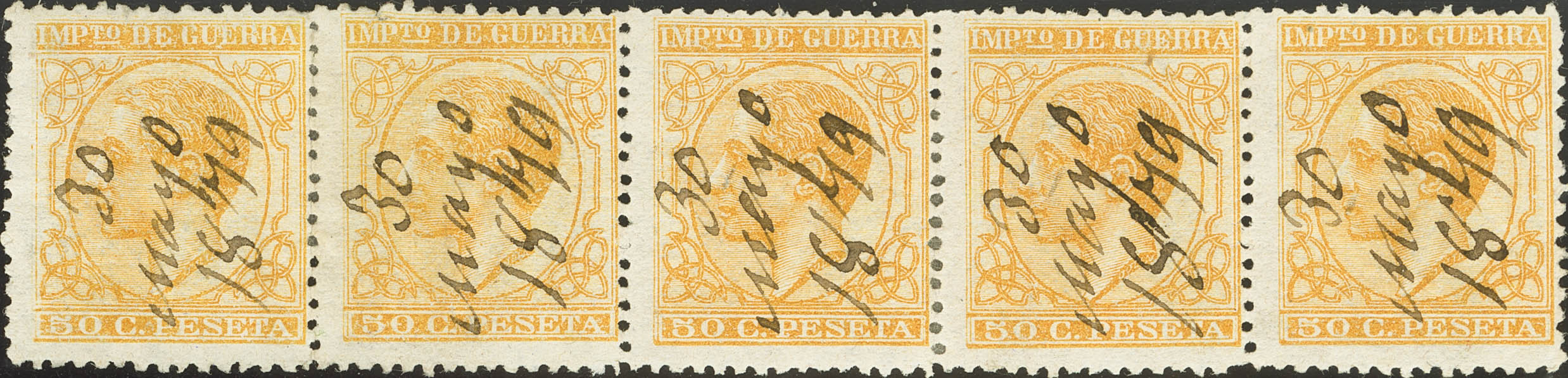189(5). 1877. 50 cts amarillo, tira de cinco sellos. Inutilizada a pluma (uso fiscal). MAGNIFICA Y MUY RARO MULTIPLO.