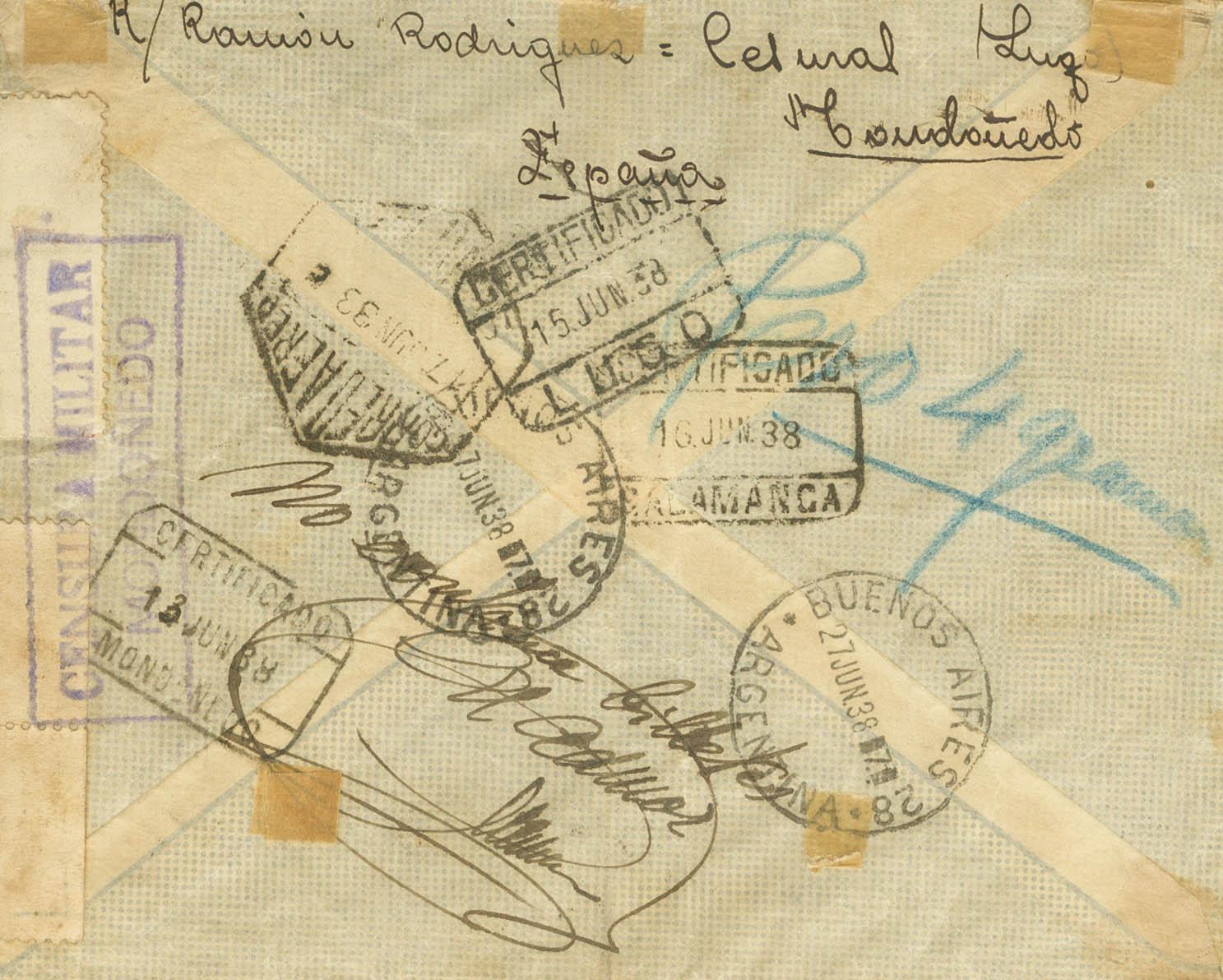 829. 1938. 4 pts rosa y diversos valores. Certificado de MONDOÑEDO (LUGO) a BUENOS AIRES. Al dorso llegada y diversos tránsitos. MAGNIFICA.