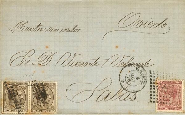 192(2), 188. 1878. 10 cts castaño, dos sellos y 15 cts carmÃn. CADIZ a SALAS (ASTURIAS). En el frente anotación manuscrita "Muestras sin valor". BONITA.