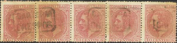 202(5). 1879. 10 cts rosa carmÃn, tira de cinco. Matasello CARTERIA / CRESPOS (Avila). MAGNIFICA Y RARA.