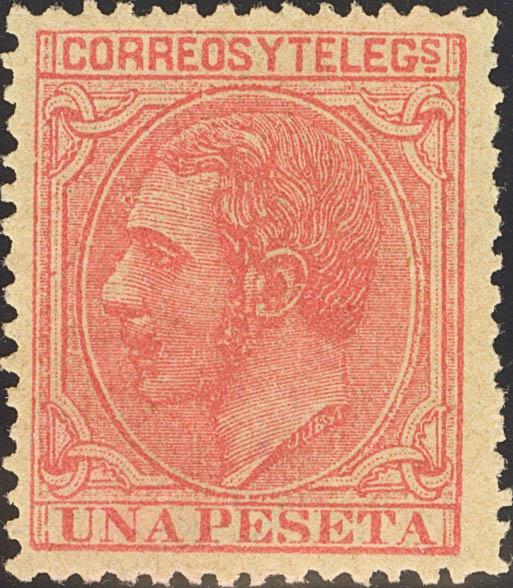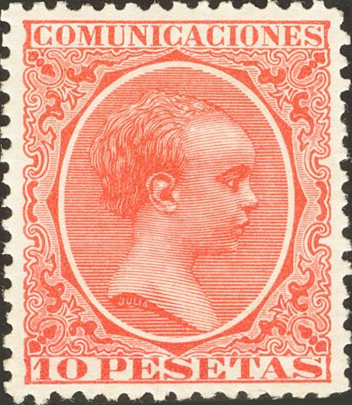 ★ 228. 1889. 10 pts bermellón (pliegue natural de goma en el margen inferior, sin importancia alguna). Color intenso y bien centrado. PIEZA DE LUJO. Cert. COMEX.