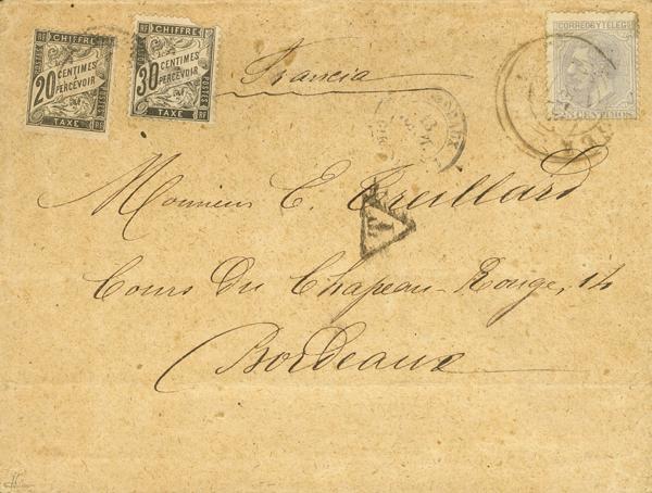 204. 1884. 25 cts azul gris. HUESCA a BURDEOS (FRANCIA). Tasada a la llegada con 50 cts (doble porte), aplicando dos sellos de tasa de Francia de 20 cts y 30 cts (el 30 cts defectito de origen). MAGNIFICA Y MUY RARA.