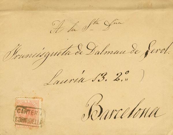 210. 1882. 15 cts naranja. CORNUDELLA (TARRAGONA) a BARCELONA. Matasello CARTERIA / CORNUDELLA, en azul y al dorso llegada. MAGNIFICA E INUSUAL EN ESTE COLOR.