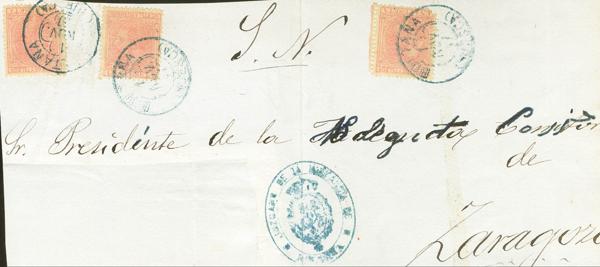 207. 1887. 1 pts rosa DOBLE IMPRESION, tres sellos. Frente de Plica Judicial de BOLTAÑA a ZARAGOZA. Matasello BOLTAÑA / (HUESCA), en azul. BONITA Y RARA VARIEDAD.
