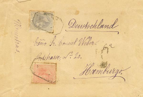 212, 207. 1885. 75 cts violeta gris y 1 pts rosa. Certificado de MADRID a HAMBURGO (ALEMANIA). En el frente manuscrito "Muestras", el franqueo corresponde a seis portes certificado de correo ordinario, según tarifa de Agosto de 1881. MAGNIFICA Y RARA COMBINACION DE FRANQUEO.