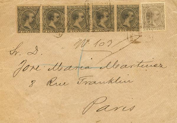 214(5), 223. 1900. 2 cts negro, cinco sellos y 40 cts castaño. Certificado de PALMA DE MALLORCA a PARIS (FRANCIA). Al dorso llegada. MAGNIFICA E INUSUAL COMBINACION DE FRANQUEO.