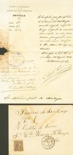 219. 1897. 15 cts castaño lila. SEVILLA a MELILLA. La administración principal de Sevilla detecta que el sello está previamente usado y envÃa un informe que se adjunta a la administración de Málaga de la que depende Melilla. BONITO E INUSUAL CONJUNTO.