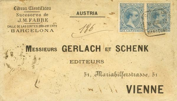 221(2). 1902. 25 cts azul, pareja. Certificado BARCELONA a VIENA (AUSTRIA). Matasello CERTIFICADO / BARCELONA. Al dorso llegada. MAGNIFICA E INUSUAL DESTINO.