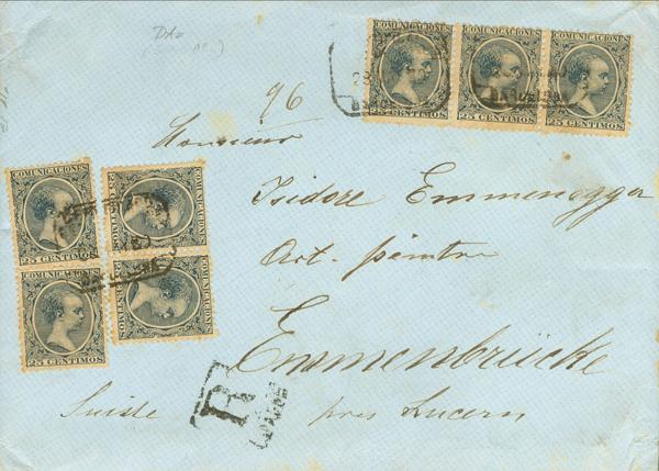 221(7). 1901. 25 cts azul, pareja, tira de tres y dos sellos sueltos. Certificado de BARCELONA a EMMENBRUCKE (SUIZA). Al dorso de la llegada. MAGNIFICA Y ESPECTACULAR.