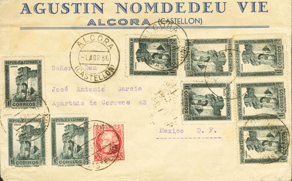 673(9). 1936. 1 pts pizarra, nueve sellos. ALCORA a MÉJICO. Matasello ALCORA / CASTELLON, al dorso llegada. MAGNIFICA Y ESPECTACULAR FRANQUEO.