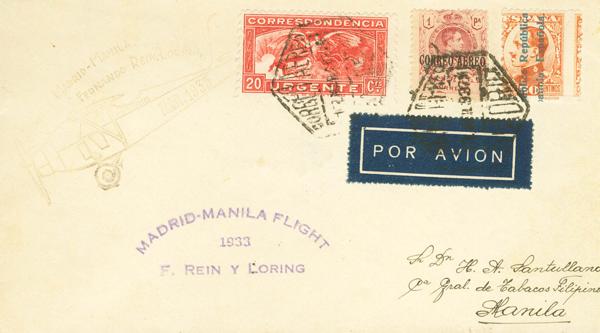 679, 296, 601. 1932. 20 cts rojo, 1 pts carmÃn y 50 cts naranja. Correo Aéreo de MADRID a MANILA (FILIPINAS). Marcas VUELO MADRID-MANILA / FERNANDO REIN LORING, en sepia y MADRID-MANILA FLIGHT / 1933 / F.REIN Y LORING, en violeta. MAGNIFICA Y MUY RARA.