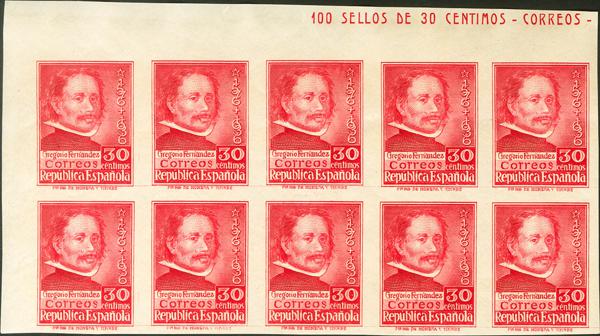 ★★ 726s(10). 1937. 30 cts carmÃn, bloque de diez, esquina de pliego. SIN DENTAR. MAGNIFICO. Edifil 2024: +440 Euros
