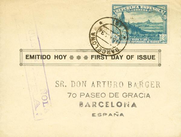757s. 1938. 45 cts + 2 pts azul SIN DENTAR. Sobres Primer DÃa Correo Interior de BARCELONA. MAGNIFICO Y RARO SELLO SIN DENTAR EN SOBRE DEL PRIMER DIA.