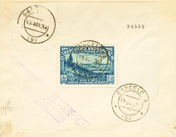 758. 1938. Hoja bloque. Sobre de Primer DÃa dirigido a BARCELONA. MAGNIFICA.