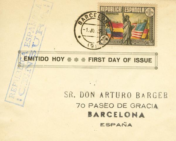 763. 1938. 1 pts multicolor, Sobre del Primer DÃa de Correo Interior de BARCELONA. MAGNIFICA.
