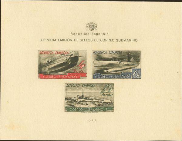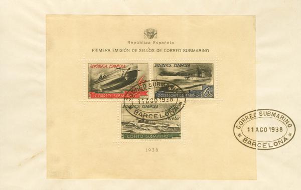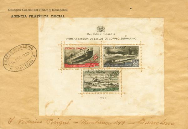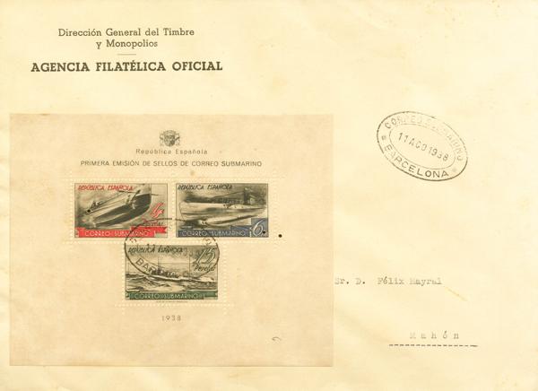 781. 1938. Hoja bloque. Correo submarino de MAHON a BARCELONA. Al dorso llegada y firma de Tomás Orós (fue el primer ambulante del correo submarino entre Mahón y Barcelona). MAGNIFICA.