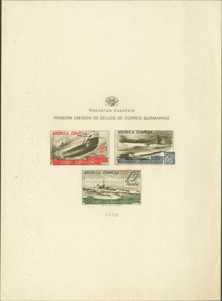 (★) 781P. 1938. Prueba definitiva de la hoja bloque CON LEYENDAS, SIN ADORNOS y PAPEL CON MARCA DE AGUA DE LA IMPRENTA. MAGNIFICA Y RARISIMA, PIEZA DE ENORME BELLEZA.