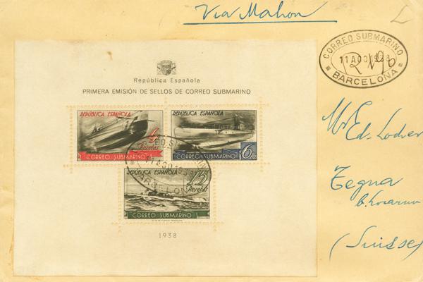 781. 1938. Hoja bloque. Correo submarino de BARCELONA a SUIZA. Al dorso llegada y tránsito por Mahón. MAGNIFICA.