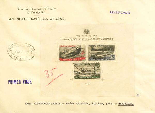 781. 1938. Hoja bloque. Correo submarino Certificado de MAHON a BARCELONA, en el frente marca "primer viaje". Al dorso llegada. MAGNIFICA.