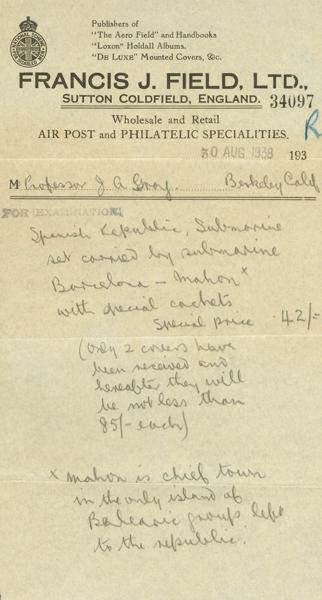 1938. Precioso documento histórico de la serie del submarino en el que se puede observar como Francis J.Field, LTD (comerciante filatélico entre 1895 y 1992), transaccionó esta serie. MAGNIFICO Y CURIOSO DOCUMENTO.