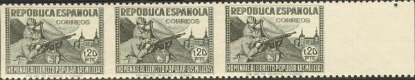 ★★ 797sv(3). 1938. 1´20 pts negro, tira de tres y borde de hoja. SIN DENTAR VERTICALMENTE. MAGNIFICA Y MUY ESPECTACULAR. Edifil 2020: ++270 Euros