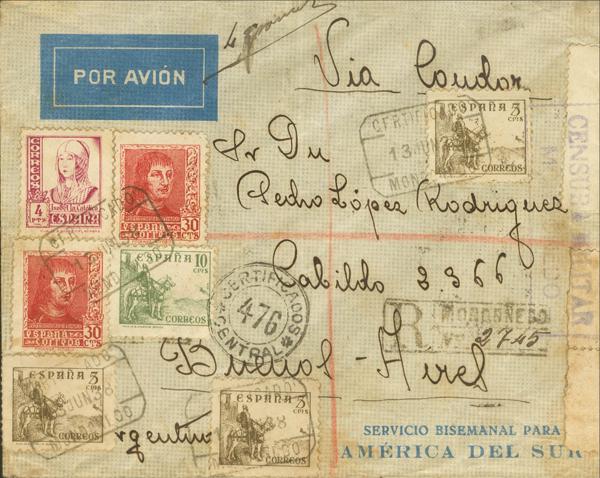 829. 1938. 4 pts rosa y diversos valores. Certificado de MONDOÑEDO (LUGO) a BUENOS AIRES. Al dorso llegada y diversos tránsitos. MAGNIFICA.
