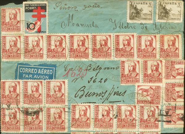823(29). 1937. 30 cts rojo, veintinueve sellos. PUENTECESURES a BUENOS AIRES (ARGENTINA). Matasello PUENTECESURES / (PONTEVEDRA), al dorso se aprecia levemente parte del matasello de llegada. MAGNIFICA Y ESPECTACULAR FRANQUEO.