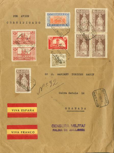 833/35. 1937. Serie completa (del 15 cts, cinco sellos y del 30 cts, dos sellos) y diversos valores. Certificado de PALMA DE MALLORCA a GRANADA. Al dorso llegada. MAGNIFICA.