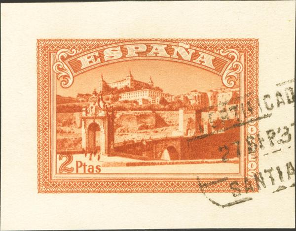 ★★ 781sa. 1938. Hoja bloque. SIN DENTAR, con adornos y Nº000000. MAGNIFICA Y RARISIMA. Cert. CEM. Edifil 2024: 5.100 Euros