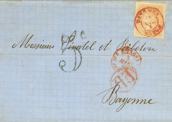 89. 1869. 12 cuartos amarillo naranja. MADRID a BAYONA (FRANCIA). Matasello NORTE / AMB.DESC., en rojo. MAGNIFICA.