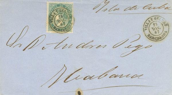 91. 1867. 10 cts verde. VILLANUEVA Y GELTRU a LA HABANA. Matasello VILLª Y GELTRU / BARCELONA. MAGNIFICA ESTAMPACION E INSUAL DESTINO A CUBA.