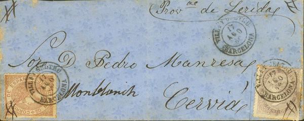 92, 96. 1868. 20 cts violeta y 50 mils castaño. Certificado de VILLANUEVA Y GELTRU (BARCELONA) a CERVIA (ITALIA). Matasello de VILLª Y GELTRU / BARCELONA, cruces en las esquinas y al dorso "RecibÃ", como es habitual en el correo certificado. MAGNIFICA Y EXTRAORDINARIAMENTE RARA, ESPECIALMENTE TRATANDOSE DE UNA ENVUELTA COMPLETA.