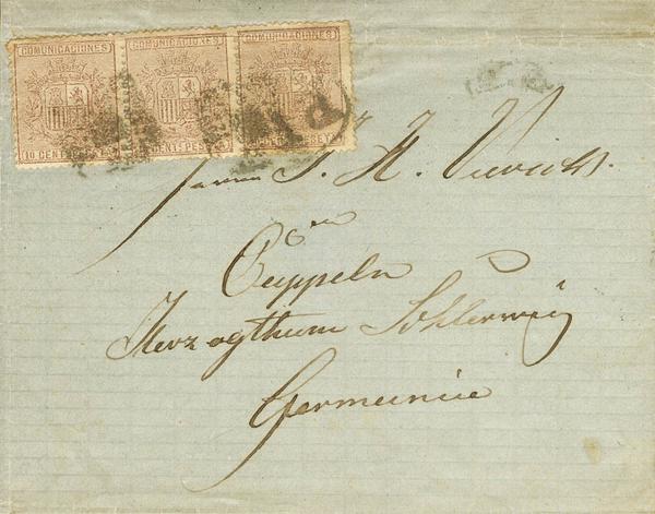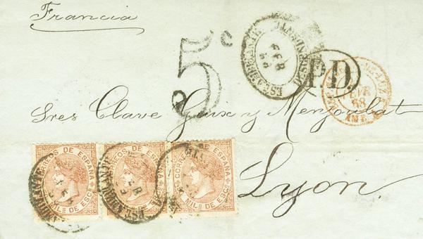 96(3). 1868. 50 mils castaño, tira de tres. VALENCIA a LYON (FRANCIA). Matasello EST. AMBULANTE / DESCENDENTE. MAGNIFICA Y RARA.