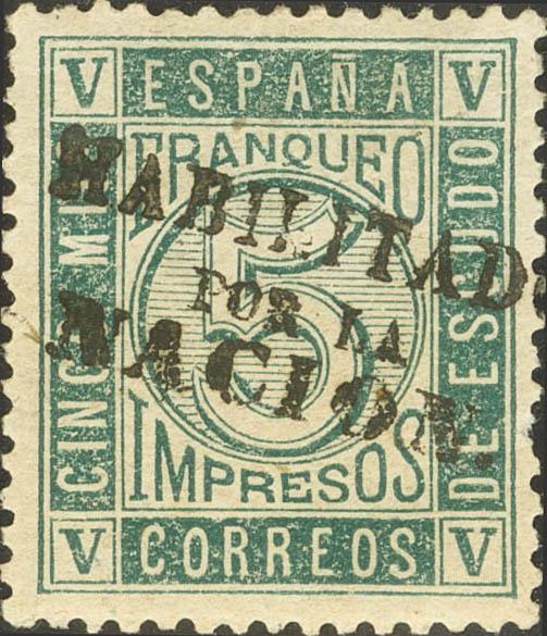 ★★ 93. 1897. 5 cts verde. Enormes márgenes y color excepcional. PIEZA DE LUJO, SIN DUDA SE TRATA DEL MEJOR EJEMPLAR OFRECIDO EN IBERPHIL.