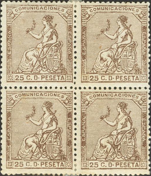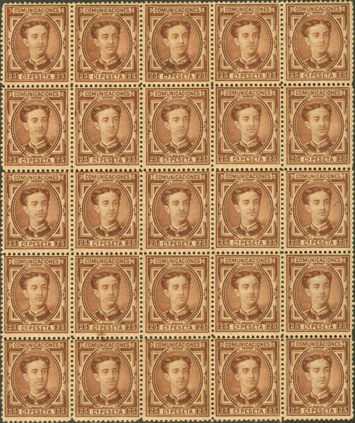 ★★/★ 177(35). 1876. 25 cts castaño, bloque de veinticinco. Muy bien centrado. MAGNIFICO Y RARO, MUY ESPECTACULAR DEBIDO A SU ALTA CALIDAD.