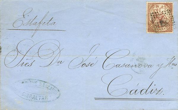 77F. 1865. 19 cuartos castaño y rosa. FALSO SPERATI (Tipo B), al dorso marca de la B.P.A. inutilizado con el matasello R.CARRETA Nº18. MAGNIFICO.