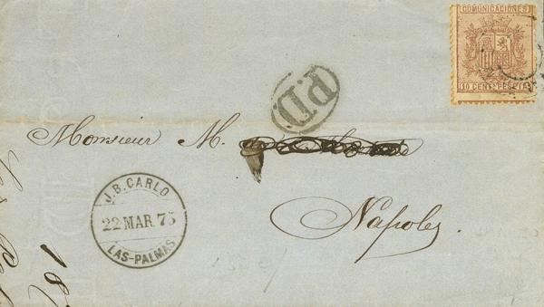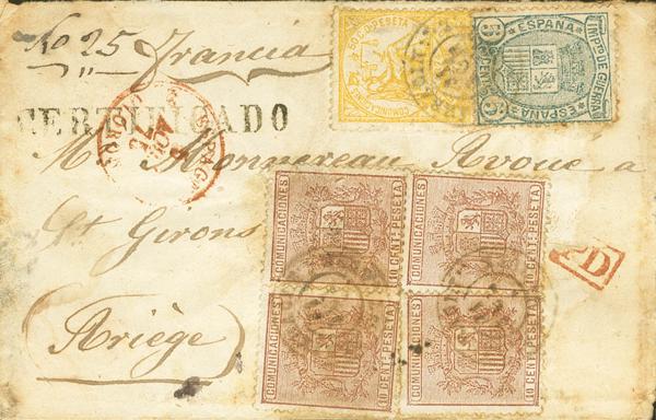 177. 1877. 25 cts castaño. AGULLANA (GERONA) a LE PERTHUS (FRANCIA). En el frente fechadores LA JUNQUERA / GERONA, en azul y ESPAGNE / LE PERTHUS, en rojo, según el experto en historia postal Esteve Domenech se trata de un franqueo fronterizo de doble porte. MAGNIFICA Y EXTRAORDINARIAMENTE RARA CARTA, SEGUN INDICA DOMENECH SE CONOCEN UN TOTAL DE TRES.
