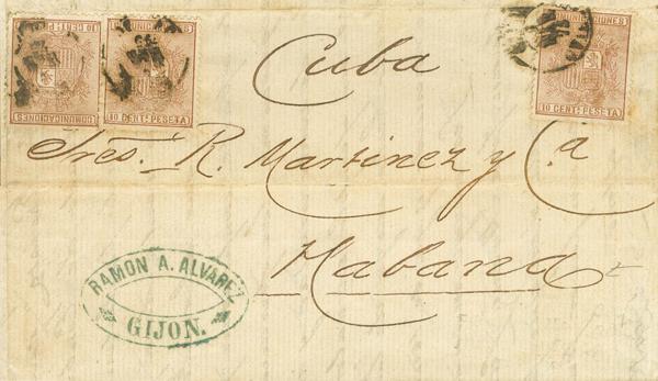 164(3), 154. 1875. 10 cts azul, tres sellos y 5 cts verde de Impuesto de Guerra. PENDUELES (ASTURIAS) a MADRID. Matasello TORRELAVEGA / SANTANDER, en tránsito. MAGNIFICA E INUSUAL FRANQUEO DE TRIPLE PORTE.