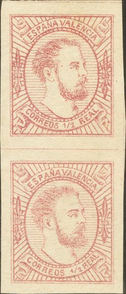 ★ 187s(2). 1876. 5 pts rosa, pareja (leve pliegue horizontal). SIN DENTAR. BONITA Y RARISIMA. Edifil 2024: +1.990 Euros