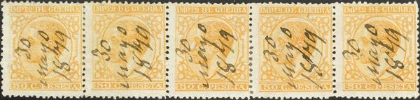 189(5). 1877. 50 cts amarillo, tira de cinco sellos. Inutilizada a pluma (uso fiscal). MAGNIFICA Y MUY RARO MULTIPLO.