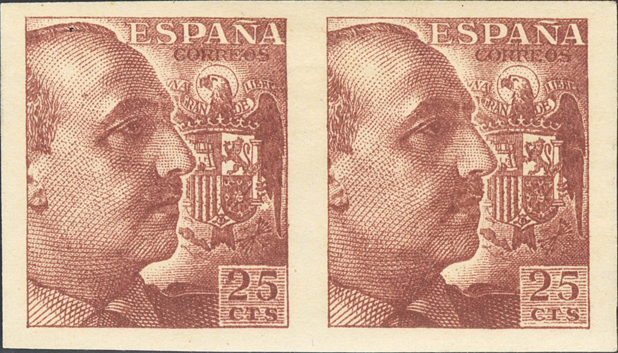★ 923ccs(2). 1939. 25 cts castaño rojizo, pareja. CAMBIO DE COLOR y SIN DENTAR. MAGNIFICA. Edifil 2021: 150 Euros