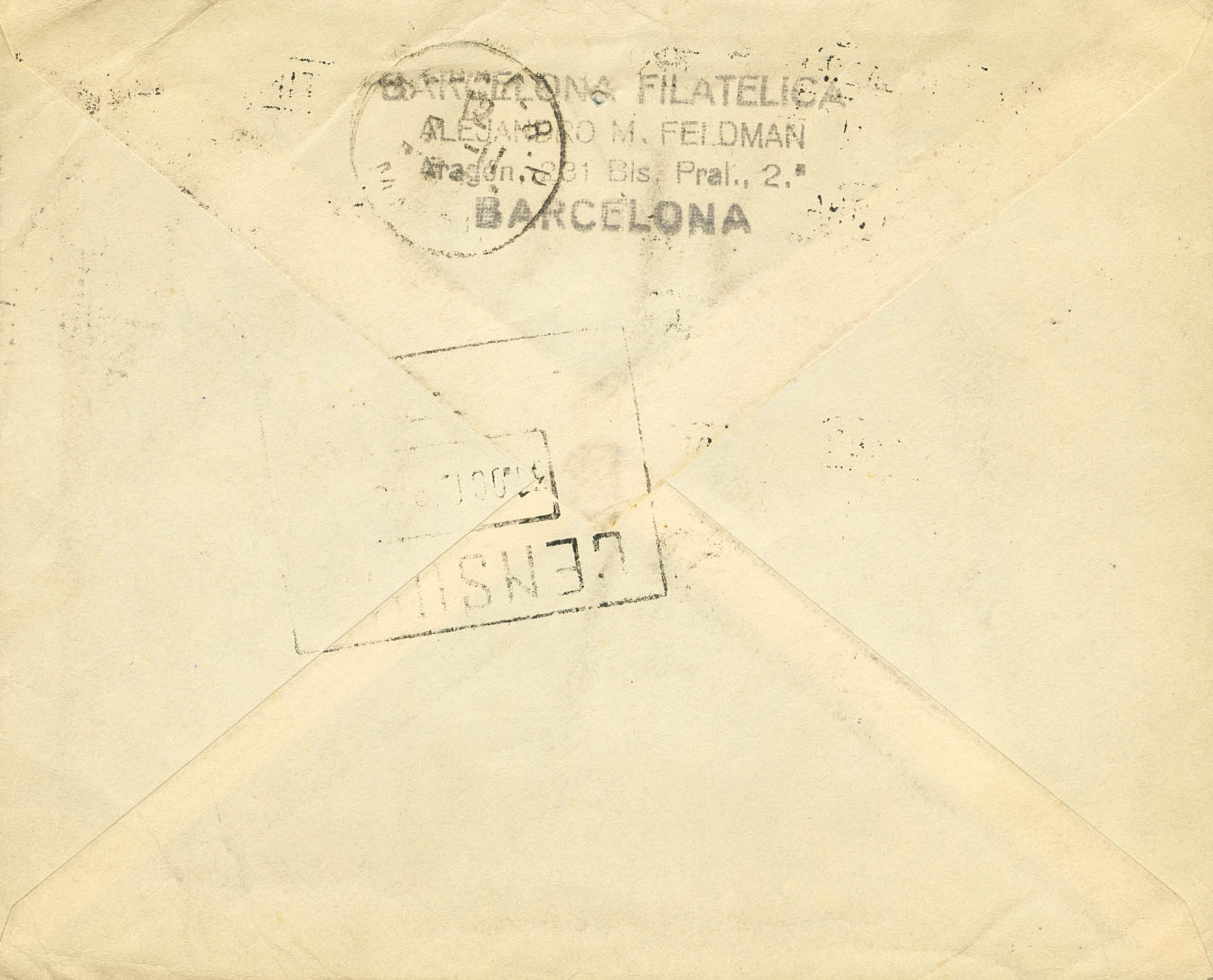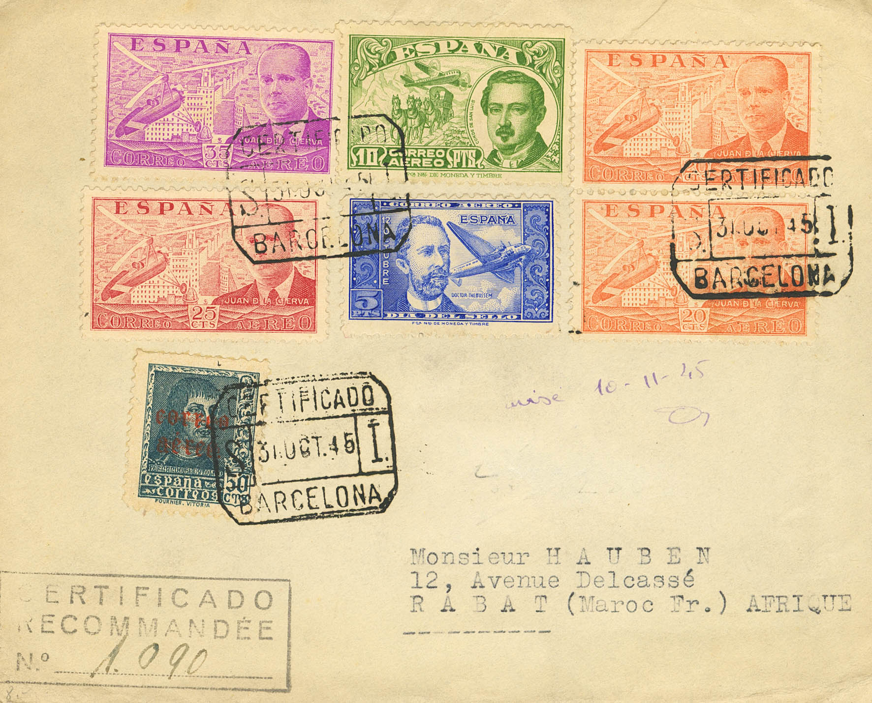 983, 990, 880/82, 845. 1945. 5 pts ultramar, 10 pts verde y diversos valores. Certificado de BARCELONA a RABAT (MARRUECOS FRANCES). Al dorso llegada. MAGNIFICA.